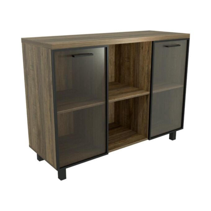 Столешница из ЛДСП толщиной 32 мм обеспечивает высокую прочность и долговечность, выдерживая интенсивное использование. Каркас и полки, изготовленные из ЛДСП толщиной 16 мм, придают конструкции надёжность и устойчивость. Фасады из стекла толщиной 4 мм, обрамлённые алюминиевым профилем, добавляют изделию современный и изысканный вид. Все материалы соответствуют классу эмиссии Е1 от производителя Томлесдрев, что гарантирует их безопасность и экологичность.