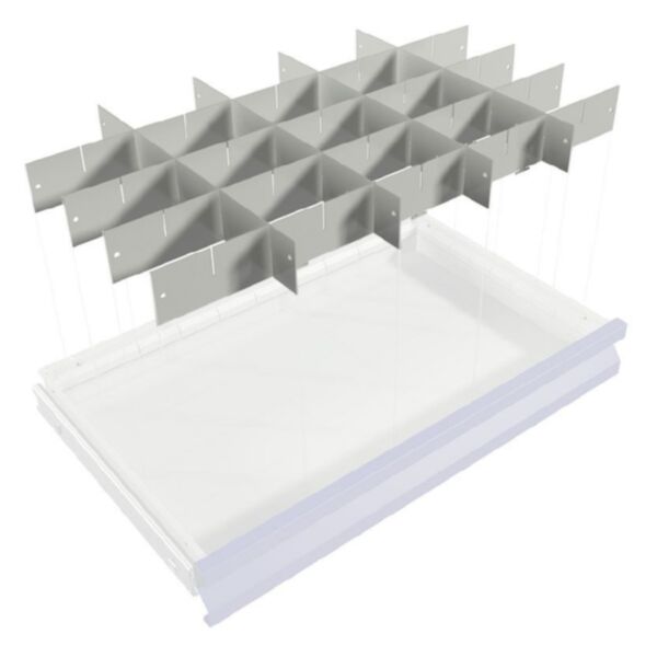 В состав набора входят восемь металлических элементов: четыре продольные и четыре поперечные перегородки. Каждая изготовлена из стали толщиной 1,2 мм, что обеспечивает высокую прочность и устойчивость к деформации при постоянной нагрузке. Перегородки легко устанавливаются и фиксируются внутри ящика, формируя замкнутые или открытые ячейки в зависимости от задачи.