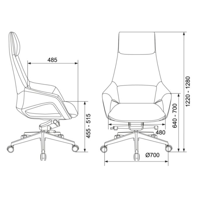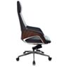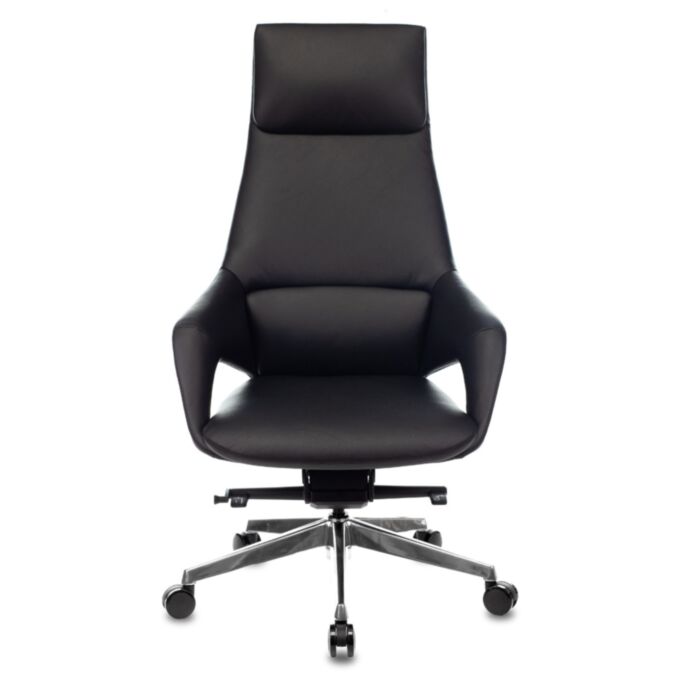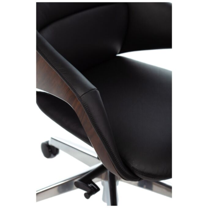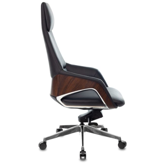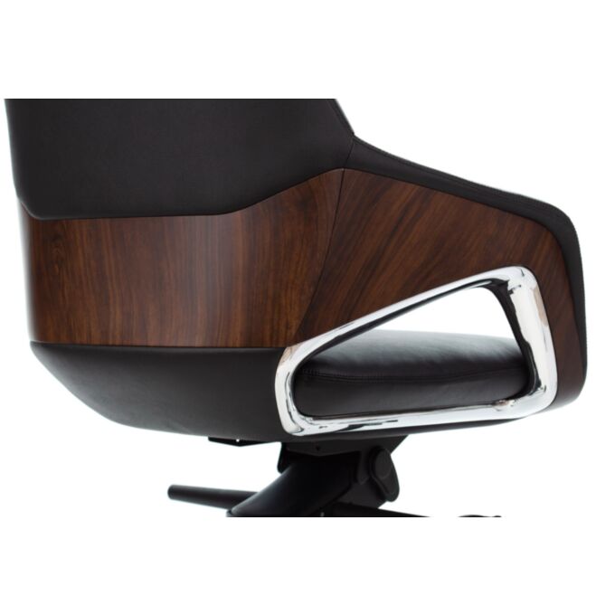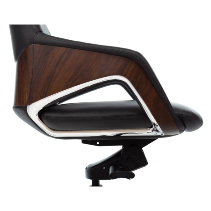 Монолитные подлокотники, отделанные кожей и украшенные пластиковыми вставками под дерево, создают дополнительный комфорт и добавляют эстетической привлекательности. Алюминиевое полированное пятилучье основание гарантирует устойчивость и надежность.