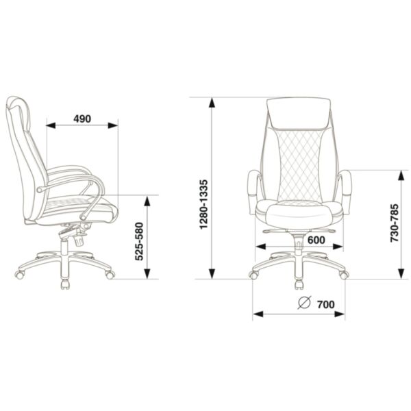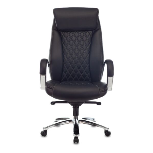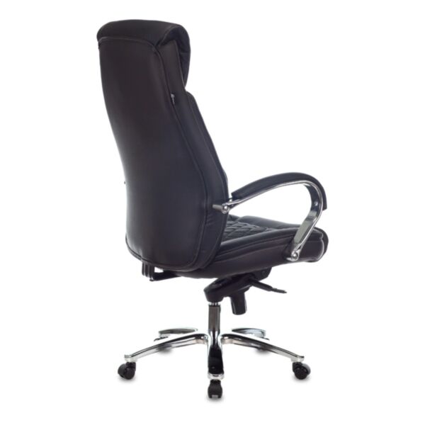 Чёрный цвет кожи и хромированные металлические подлокотники с накладками придают креслу современный стиль и элегантность. Основание из хромированного металлического пятилучья гарантирует прочность и устойчивость.