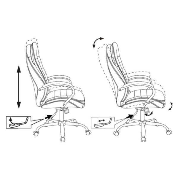Хромированные металлические подлокотники с накладками обеспечивают надежную поддержку для рук, а хромированное металлическое пятилучье обеспечивает устойчивость и долговечность конструкции.