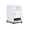 Металлическая тумба медицинского назначения модели ТП-3 предназначена для размещения личных вещей, медицинских приборов и документации в учреждениях здравоохранения. Её конструкция позволяет использовать изделие как прикроватную тумбочку в палатах, а также как вспомогательную мебель в процедурных, диагностических и административных помещениях. Модель выполнена в разборном исполнении, что упрощает транспортировку и хранение. Тумба оборудована выдвижным ящиком на телескопических направляющих, которые обеспечивают плавное движение и полное открытие, позволяя эффективно использовать весь внутренний объём. Под ящиком находится просторное отделение с регулируемой металлической полкой, закрываемое дверцей с хромированной ручкой. Ещё ниже предусмотрена открытая ниша для быстрого доступа к часто используемым предметам. Конструкция установлена на четыре колеса диаметром 50 мм, два из которых оснащены стопорными механизмами для надёжной фиксации тумбы в нужном положении. Максимально допустимая равномерная нагрузка на полку составляет 15 кг. Габаритные размеры изделия в собранном виде: 716* × 655 × 423 × 492 мм (высота указана с колёсами). Вес изделия — 15,3 кг. Упаковка имеет размеры 885 × 540 × 120 мм, масса — 15,9 кг. Внешняя поверхность покрыта белой полимерно-порошковой краской (RAL 9016), устойчивой к влаге, механическим повреждениям и воздействию дезинфицирующих средств.