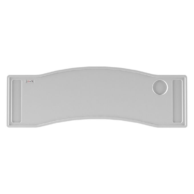 Конструкция выполнена из прочного светло-серого пластика, устойчивого к регулярной санитарной обработке. Плоская столешница исключает риск опрокидывания предметов, а специальное боковое углубление предназначено для установки стакана или кружки, обеспечивая их устойчивость.