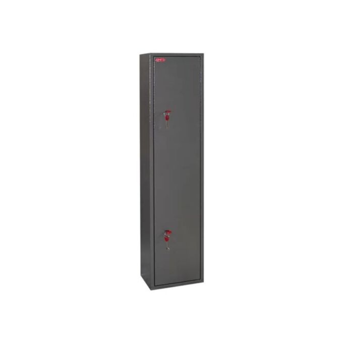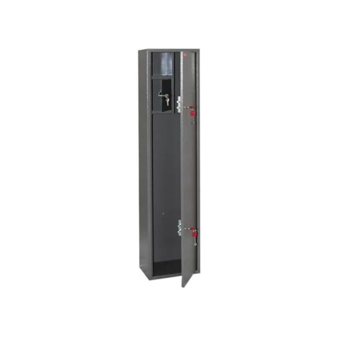 Запирающая система включает два замка шестисувальдного типа «Просам», соответствующих требованиям ГОСТ 5089–2003 по взломостойкости. Эти механизмы препятствуют несанкционированному вскрытию, обеспечивая дополнительный уровень безопасности. В верхней части расположена отдельная секция с индивидуальным замком, предназначенная для хранения патронов и других мелких предметов.