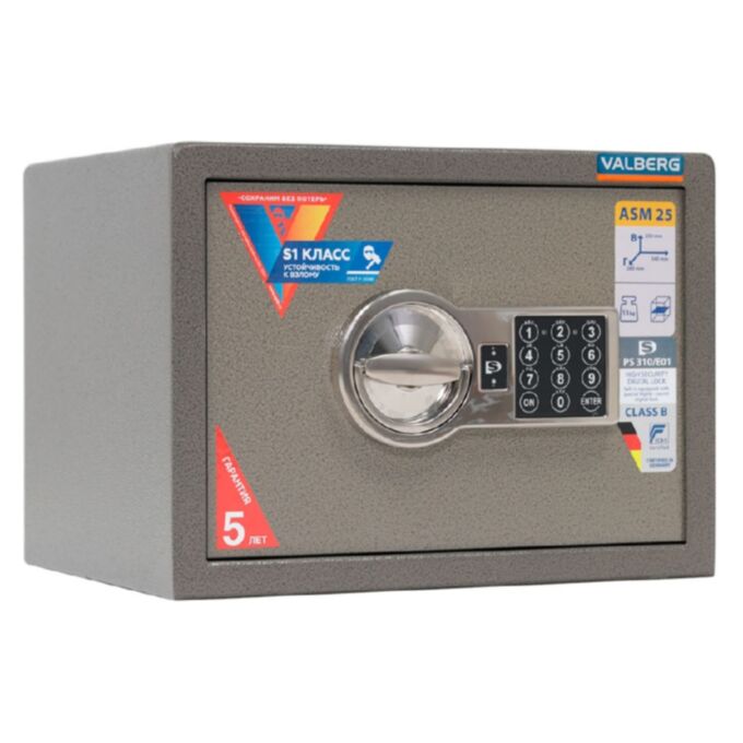 ASM.25-EL — это компактный сейф, разработанный для хранения документов, наличных денег и других ценных предметов в условиях дома или офиса. Изделие соответствует требованиям ГОСТ Р 55148-2012 и относится к классу взломостойкости S1, что подтверждает его базовую защиту от несанкционированного доступа.