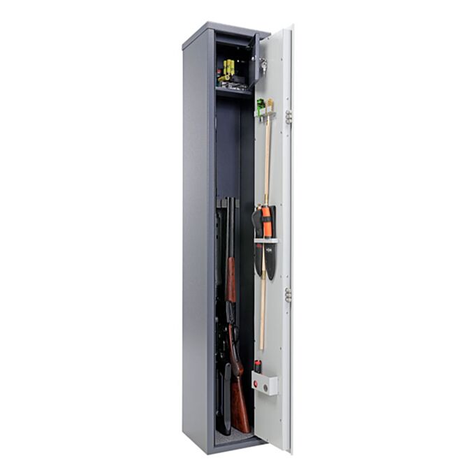 Корпус и дверное полотно выполнены из стали толщиной до 2 мм, что соответствует требованиям к сейфам для хранения оружия гражданского назначения. Внутреннее пространство организовано максимально рационально: предусмотрены ложементы для ружей, полки, а также отдельный отсек для патронов, закрывающийся на ключ. Высота оружейного отделения рассчитана на размещение стволов длиной до 1320 мм, а также учтён линейный размер от дна до трейзера* — для точного планирования внутреннего размещения.