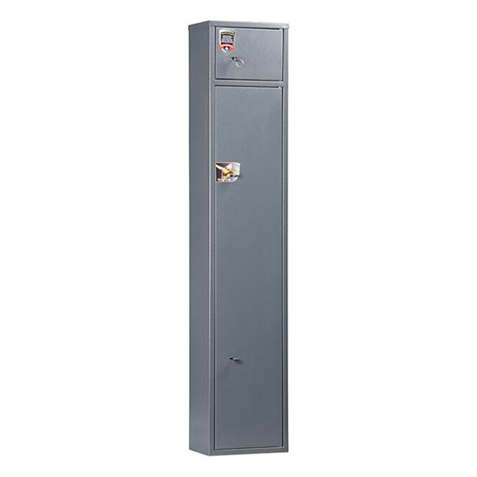 Внутреннее пространство рассчитано на размещение оружия с максимальной длиной ствола до 1300 мм. Это позволяет удобно хранить большинство распространённых моделей охотничьих и служебных ружей без необходимости их разборки. Корпус выполнен из прочного металла, а дверь фиксируется с помощью двух независимых ключевых замков сувальдного типа, обеспечивающих защиту от несанкционированного доступа.