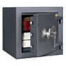 Толщина двери — 98 мм, стенки — 58 мм, что соответствует требованиям к сейфам для ответственного хранения. Система оборудована отверстием под сигнализацию, опечатывающим устройством, и поддерживает монтаж анкерного крепления к полу (болт включён). Установлен ключевой замок KABA MAUER — поставляется с тремя ключами. Опционально можно добавить трейзер или дополнительные полки.