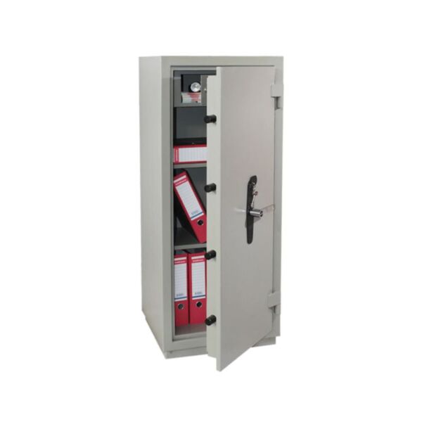 Конструкция предусматривает наружные петли, позволяющие открывать дверцу на 180 градусов, что обеспечивает удобный доступ ко всему содержимому. Офисный сейф КЗ-065 Т — это надёжное и удобное решение для организации защищённого хранения в рабочих и административных помещениях.