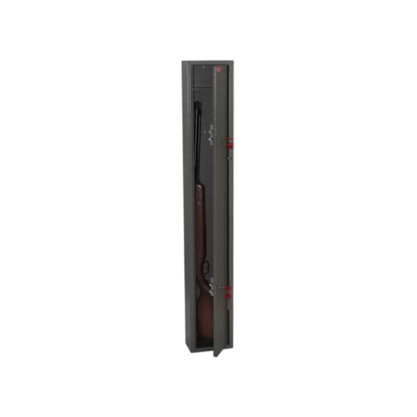 Внутреннее пространство шкафа организовано с учетом удобства пользователя. В верхней части расположены две съемные полки, которые позволяют эффективно распределять содержимое, обеспечивая рациональное хранение боеприпасов и других необходимых предметов. Такая конструкция делает шкаф универсальным и удобным для эксплуатации.