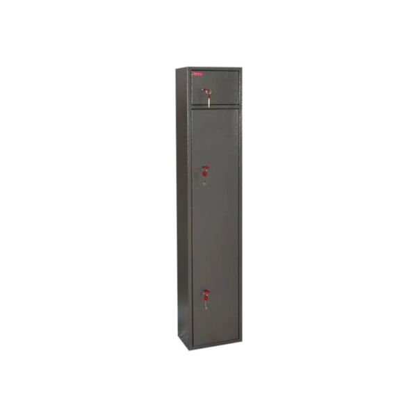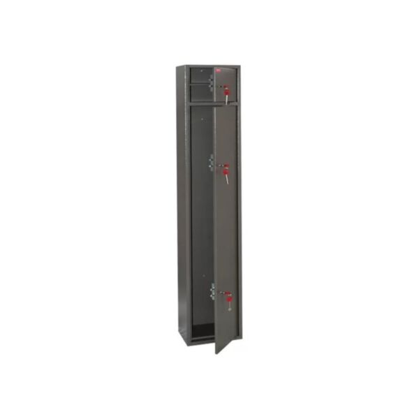 Система запирания включает три шестисувальдных замка «Просам», соответствующих II классу взломостойкости по ГОСТ 5089-2003. Эти механизмы обеспечивают надежную защиту содержимого, препятствуя несанкционированному доступу. В верхней части шкафа предусмотрен изолированный отсек с отдельным замком, который можно использовать для хранения боеприпасов или размещения короткоствольного оружия.