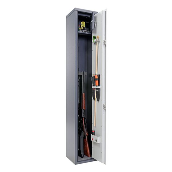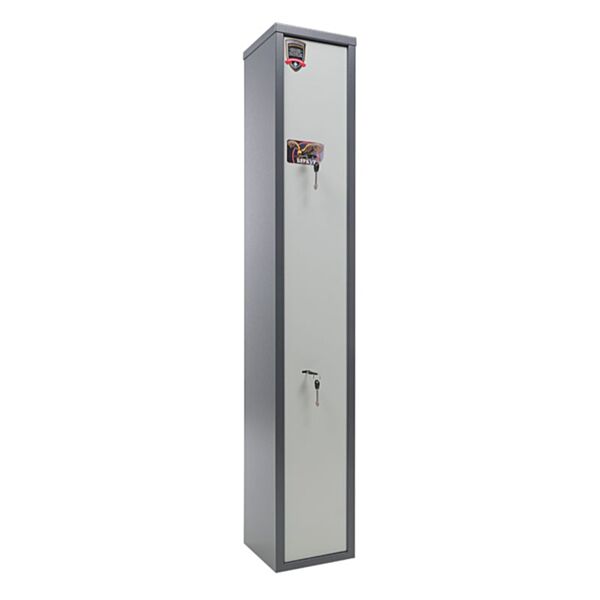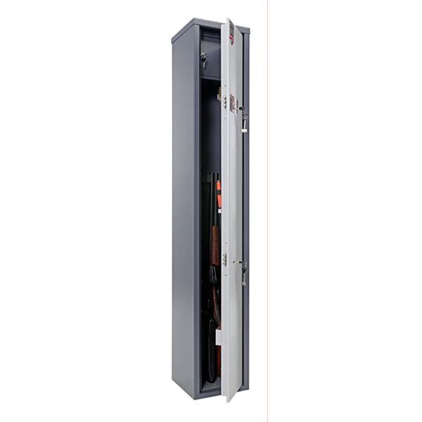 Оружейный сейф «Беркут 3» разработан для хранения огнестрельного оружия и патронов в соответствии с действующими нормативами, установленными Постановлением Правительства РФ №814. Он предназначен для эксплуатации в домашних или служебных условиях и обеспечивает базовую защиту от несанкционированного доступа. Корпус и дверное полотно выполнены из стали толщиной до 2 мм, что соответствует требованиям к сейфам для хранения оружия гражданского назначения. Внутреннее пространство организовано максимально рационально: предусмотрены ложементы для ружей, полки, а также отдельный отсек для патронов, закрывающийся на ключ. Высота оружейного отделения рассчитана на размещение стволов длиной до 1320 мм, а также учтён линейный размер от дна до трейзера* — для точного планирования внутреннего размещения. Запирание осуществляется с помощью двух ключевых замков, обеспечивающих надёжную фиксацию дверцы. Также конструкцией предусмотрены анкерные отверстия на задней стенке — они позволяют установить сейф с жёстким креплением к стене, что исключает возможность его выноса или смещения. «Беркут 3» — надёжное решение для владельцев оружия, которым важно соблюдать требования хранения, но при этом получить вместительный и удобный в использовании сейф для повседневной эксплуатации.