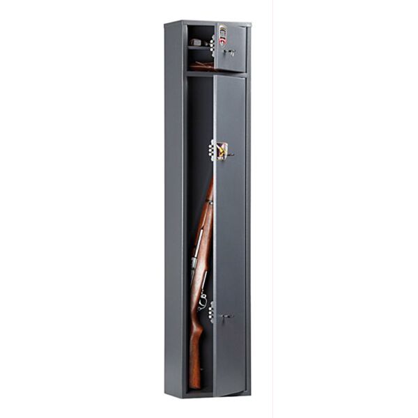 Внутреннее пространство рассчитано на размещение оружия с максимальной длиной ствола до 1300 мм. Это позволяет удобно хранить большинство распространённых моделей охотничьих и служебных ружей без необходимости их разборки. Корпус выполнен из прочного металла, а дверь фиксируется с помощью двух независимых ключевых замков сувальдного типа, обеспечивающих защиту от несанкционированного доступа.