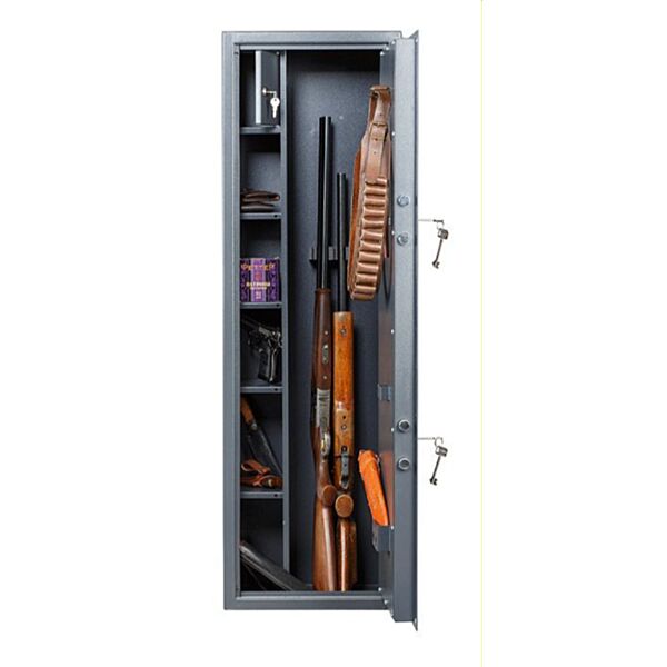 Сейф рассчитан на размещение оружия со стволом длиной до 1384 мм. Внутри предусмотрено запираемое патронное отделение, а также полки и ложементы для аккуратной фиксации ружей. Такая организация внутреннего пространства обеспечивает удобное и безопасное хранение с соблюдением принципа раздельного размещения оружия и боеприпасов.