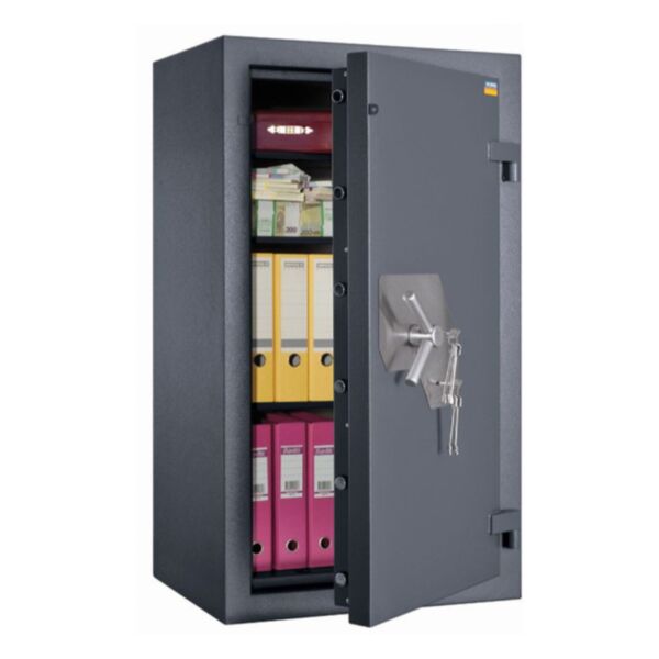 Сейф оборудован ключевым замком немецкого производства KABA MAUER — в комплект включены три ключа. Для дополнительной безопасности предусмотрена возможность крепления к полу — анкерный болт входит в базовую комплектацию. На задней стенке имеется технологическое отверстие под проводку сигнализации. Также предусмотрена возможность опечатывания. При необходимости изделие может быть дополнено трейзером или внутренними полками.