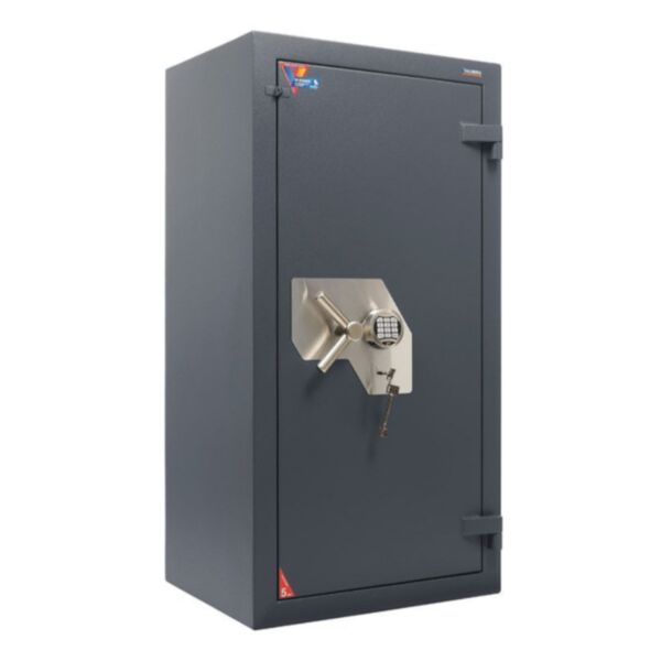 В конструкции применена комбинированная система замков: электронный механизм PS 610/E36 (ПРОМЕТ) сочетается с ключевым замком KABA MAUER, произведённым в Германии. Такое техническое решение обеспечивает повышенный уровень защиты и двойной контроль доступа. В нижней части корпуса предусмотрено анкерное крепление, позволяющее надёжно зафиксировать сейф на полу — крепёжный элемент входит в комплект. На задней стенке расположено специальное отверстие для подключения к системе сигнализации. Дополнительно реализована возможность опечатывания, что обеспечивает визуальный контроль целостности доступа.