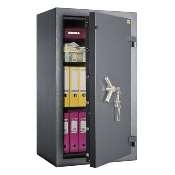Сейф построен на базе прочной металлической конструкции, усиленной ригельным механизмом с трёхсторонним замыканием. При попытке силового вскрытия активируется встроенная система блокировки. Зоны, где расположены ригели и замок, защищены от механического повреждения, включая сверление и выбивание. Дверная плита толщиной 98 мм и корпус со стенками 55 мм создают серьёзный барьер для несанкционированного доступа.