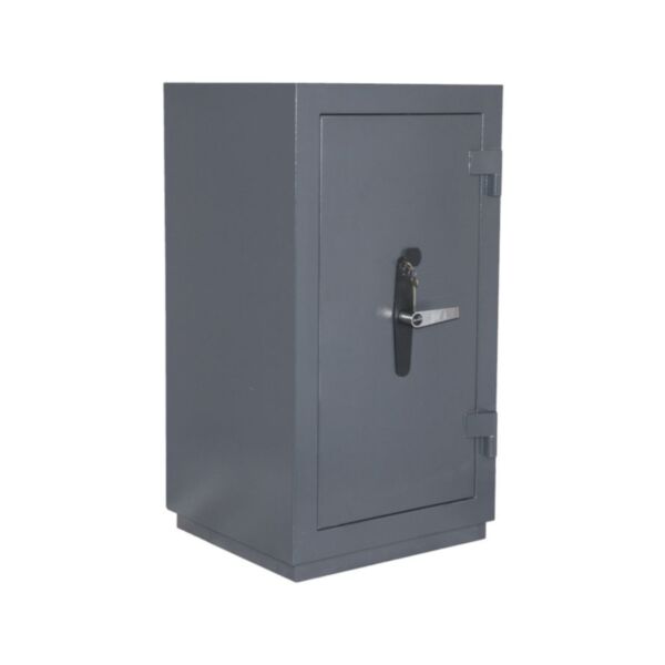 Система запирания дверцы сейфа состоит из трех активных ригелей диаметром 28 мм, которые выдвигаются в стороны, и одного пассивного ригеля, расположенного со стороны петель. Эта конструкция гарантирует высокий уровень защиты и исключает возможность несанкционированного вскрытия. Сейф оборудован сертифицированным ключевым замком, что обеспечивает дополнительную безопасность содержимого. Внутри устройства есть отсек с ограниченным доступом (трейзер) и одна полка для удобной организации пространства и хранения различных предметов.