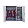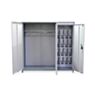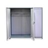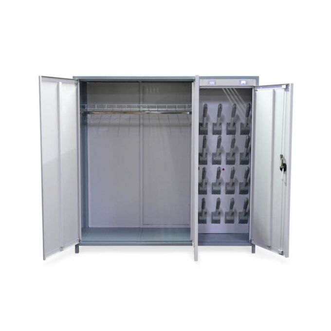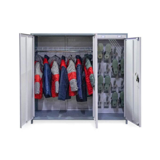Корпус шкафа выполнен из прочного металла с рамной конструкцией, что гарантирует надёжность и устойчивость. Внутреннее пространство разделено на два независимых сектора: отделение для одежды и отделение для обуви.