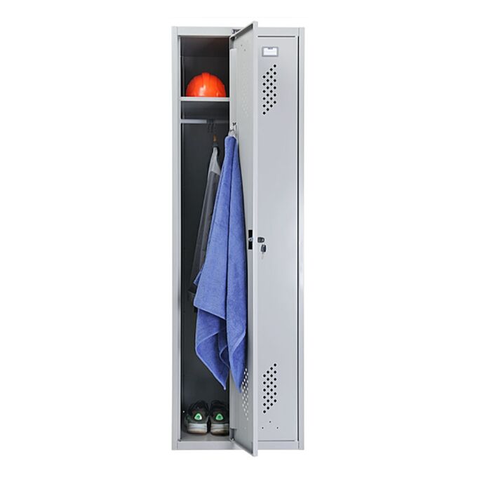 Модель LS-21 предназначена для индивидуального хранения одежды и личных вещей в раздевалках различных типов — от промышленных объектов до спортивных и административных помещений. Также используется в зонах хранения, камерах и гардеробных системах. Шкаф выполнен из прочного металла и поставляется в разобранном виде. Монтаж осуществляется с помощью зацепов и саморезов — крепёж входит в комплект. Конструкция предусматривает вентиляционные отверстия, обеспечивающие свободную циркуляцию воздуха внутри. Каждая секция оснащена надёжным замком «Практик» с ключевым механизмом, поддерживающим до 2000 уникальных комбинаций. Направление открывания дверей (влево или вправо) можно определить при сборке, адаптируя шкаф под особенности планировки помещения. Модули соединяются между собой для формирования непрерывного ряда. Базовая комплектация включает прочную полку из металла, перекладину для размещения вешалок и комплект крючков. Дополнительно шкаф может быть укомплектован по желанию заказчика следующими элементами: – замком под навесной ключ (модель Euro-locks A129, исполнение PL***) – кодовым замком — механическим или электронным, в зависимости от требований – полкой для хранения обуви – скамьёй либо подставкой для повышения комфорта при эксплуатации – наклонной крышей для предотвращения скопления пыли и мусора сверху