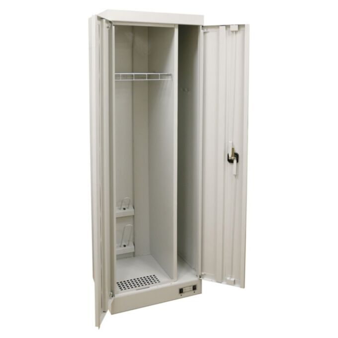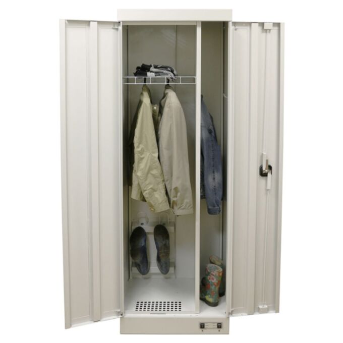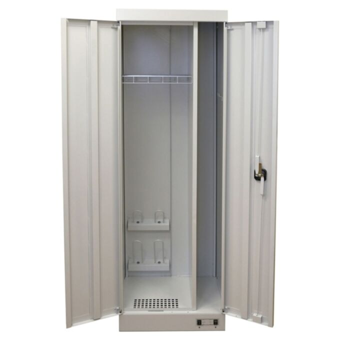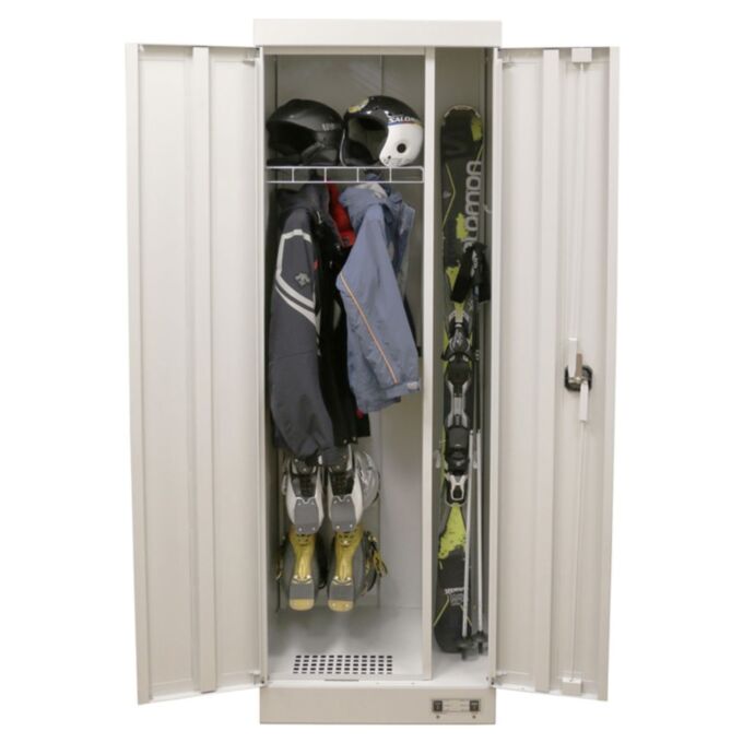 Верхняя часть корпуса разделена глухой перегородкой на отделение для сушки одежды и отделение для хранения спортивного инвентаря (например лыж) и закрывается двумя дверьми, в одной из которых установлен ригельный замок, запирающий одновременно обе двери. Внутри отделение для одежды снабжено съемной сетчатой полкой для подвешивания плечиков с одеждой, держателями для обуви и перчаток.