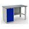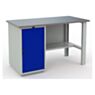 Все металлические элементы верстака покрыты стойкой к истиранию порошковой краской, обеспечивающей защиту от коррозии и механических повреждений. Корпус окрашен в серый цвет с выразительной текстурой «шагрень» (RAL 7038), придающей поверхности матовый и практичный вид. Лицевая панель дверцы тумбы выполнена в насыщенном синем оттенке (RAL 5002), что добавляет яркий акцент и подчёркивает современный промышленный дизайн.