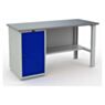 Верстак окрашен порошковым способом: корпус — в серый цвет с текстурой шагрень (RAL 7038), фасад дверцы — в насыщенный синий (RAL 5002), что придаёт изделию современный и аккуратный внешний вид. По желанию конструкция может быть дооснащена перфорированным экраном, осветительным модулем и подвесными аксессуарами для хранения инструментов и оснастки.