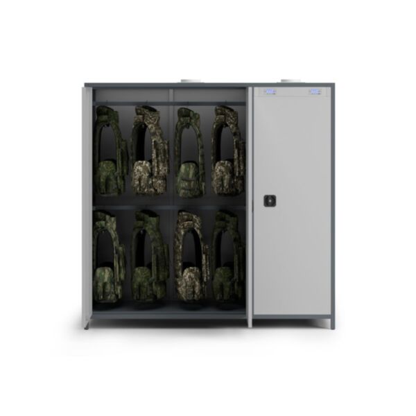 Отделение для одежды оснащено полкой-сеткой для головных уборов и перекладиной для вешалок, что позволяет удобно размещать вещи. В модификации RANGER-8Б предусмотрены две перекладины, обеспечивающие сушку бронежилетов в два яруса, что значительно увеличивает вместимость. В отсеке для обуви установлены съемные насадки, на которые надевается обувь, обеспечивая равномерный прогрев и быструю сушку.