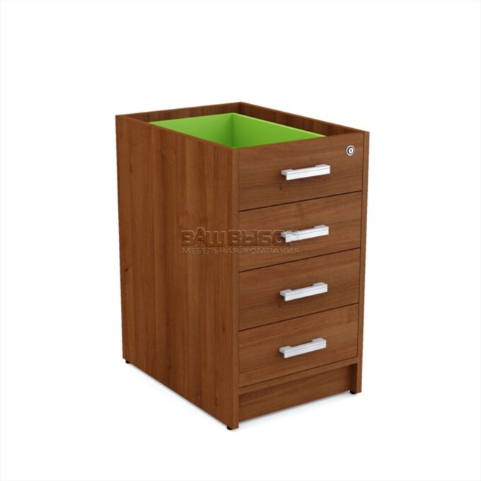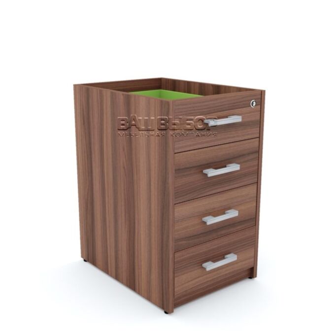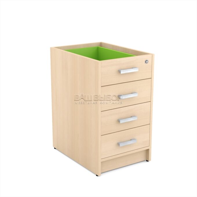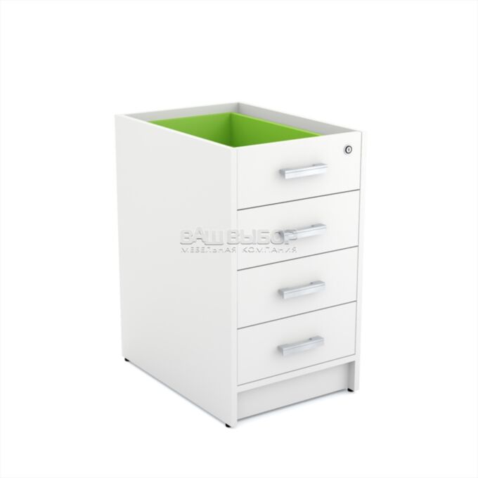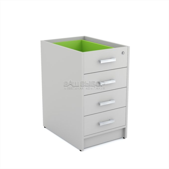 Тумба оснащена тремя вместительными ящиками, верхний из которых оборудован замком для хранения личных предметов, документации или других конфиденциальных материалов. Регулируемые по высоте опоры обеспечивают устойчивость конструкции на любой поверхности, позволяя компенсировать неровности пола и улучшая эксплуатационные характеристики мебели.