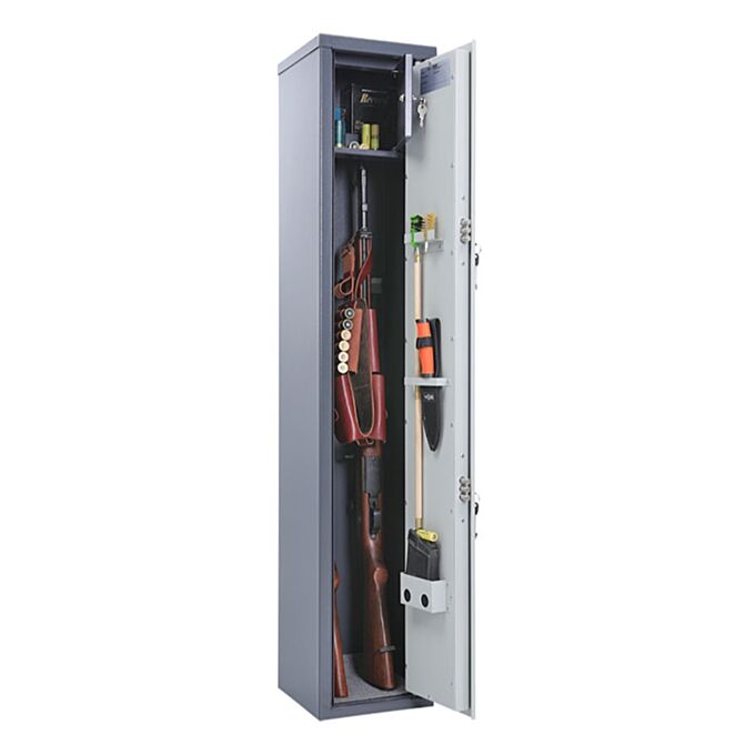 Корпус и дверное полотно изготовлены из металла толщиной до 2 мм, что обеспечивает необходимую защиту от несанкционированного доступа и соответствует базовым требованиям безопасности. Внутри предусмотрена продуманная организация: ложементы для ружей, несколько полок для хранения принадлежностей, а также отдельное патронное отделение, закрывающееся на ключ. Сейф рассчитан на хранение оружия длиной до 1150 мм, что делает его универсальным для большинства популярных моделей.
