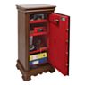 Система запирания реализована в виде трёхстороннего ригельного механизма с массивными штырями, что исключает доступ к содержимому в случае попытки взлома. Внешняя отделка сейфа выполнена из натурального дубового шпона с возможностью тонировки под мебель заказчика, а внутренняя отделка представляет собой мягкое бархатное покрытие, обеспечивающее бережное хранение ценностей.