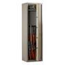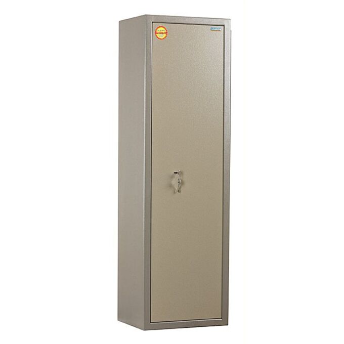 Модель позволяет размещать длинноствольное оружие с максимальной длиной ствола до 1435 мм. Корпус изготовлен из стали толщиной 3 мм, а лицевая панель усилена до 10 мм, что существенно повышает устойчивость конструкции к внешнему воздействию. За фиксацию двери отвечает трёхсторонняя ригельная система, обеспечивающая надёжную блокировку сразу по нескольким направлениям, предотвращая несанкционированный доступ.