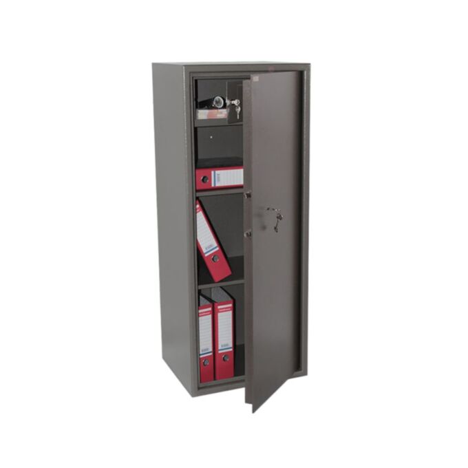 Сейф КМ-1200 Т представляет собой усиленную конструкцию, разработанную для безопасного хранения документов, денежных средств и других ценностей. Основа выполнена из металлического листа толщиной 2,5 мм, что обеспечивает надёжную защиту от внешних воздействий. Дверное полотно усилено стальной панелью толщиной 5 мм, что значительно увеличивает его сопротивляемость механическим повреждениям и попыткам взлома. Внутренний отсек дополнительно оборудован укрепляющим элементом толщиной 1,4 мм, что повышает общий уровень безопасности.