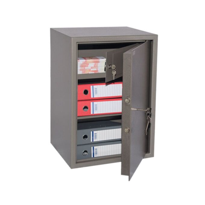 Офисный сейф КМ-620 Т — это прочная и надёжная конструкция, предназначенная для защиты важных документов, денежных средств и ценных вещей. Корпус выполнен из стали толщиной 2 мм, что обеспечивает устойчивость к механическим воздействиям и внешним нагрузкам. Дверное полотно усилено металлической пластиной толщиной 5 мм, что значительно повышает уровень безопасности и предотвращает попытки взлома.
