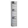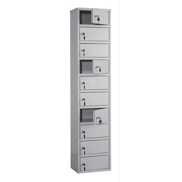Модель включает десять изолированных отделений, каждое из которых оснащено собственным ключевым замком, что исключает несанкционированный доступ. Для повышения устойчивости и предотвращения перемещений предусмотрена возможность крепления шкафа к стене.