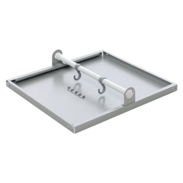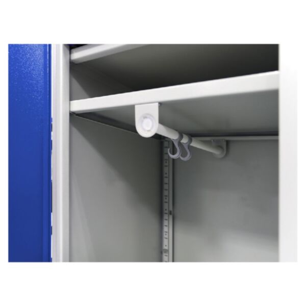 Модуль устанавливается в одну из секций шкафа и не требует сложных инструментов для монтажа — весь процесс сборки занимает минимум времени. Его конструкция продумана до мелочей: прочная металлическая полка выдерживает нагрузку до 80 кг, а штанга для плечиков рассчитана на 10 кг, что позволяет хранить как лёгкую спецодежду, так и верхнюю одежду сотрудников. При этом предусмотрена возможность использовать обычные вешалки, применяемые в бытовых условиях, что делает эксплуатацию интуитивно понятной и удобной.