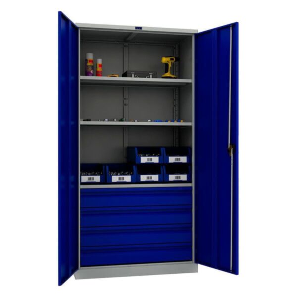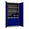 Каркас и дверцы изготовлены из стали толщиной 0,8 мм, что обеспечивает устойчивость к механическим нагрузкам и долгий срок службы. Модель выдерживает до 500 кг суммарной нагрузки, а каждая полка рассчитана на размещение до 80 кг оборудования или инструмента. Полки регулируются по высоте с шагом 50 мм, что позволяет оптимизировать внутреннее пространство под конкретные задачи.