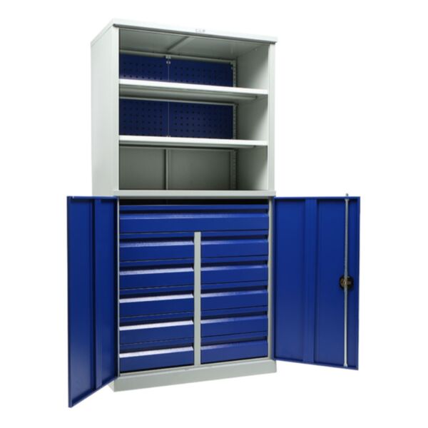 Основные элементы корпуса и дверей выполнены из стали толщиной 0,8 мм, что обеспечивает устойчивость к нагрузкам и повреждениям. Общая грузоподъёмность шкафа достигает 500 кг, при этом каждая полка выдерживает до 80 кг, а ящик — до 30 кг. Конструкция предусматривает возможность перестановки полок по высоте с шагом 50 мм, что позволяет легко подстроить внутреннее пространство под конкретные задачи и тип размещаемых предметов.