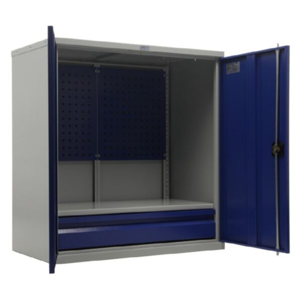 Корпус и дверцы выполнены из стали толщиной 0,8 мм, что обеспечивает высокую механическую прочность и стойкость к износу. Общая нагрузка на корпус может достигать 500 кг. При этом каждая полка выдерживает до 80 кг, а выдвижной ящик — до 30 кг. Полки можно перемещать по высоте с интервалом в 50 мм, что позволяет легко менять внутреннюю конфигурацию под тип и размеры размещаемых предметов.