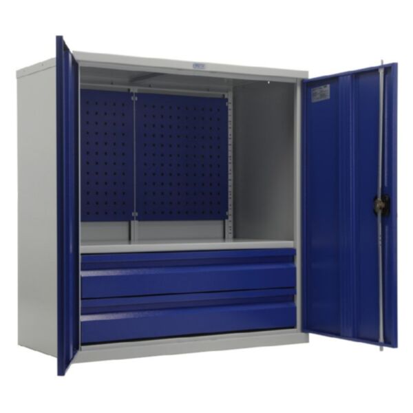 Каркас и дверцы шкафа изготовлены из прочной стали толщиной 0,8 мм, что гарантирует высокую жёсткость конструкции и долгий срок службы. Конструкция выдерживает нагрузку до 500 кг. Каждая полка рассчитана на вес до 80 кг, а ящик — до 30 кг. Возможность регулировки высоты установки полок с шагом 50 мм позволяет гибко настраивать внутреннее пространство под текущие задачи.
