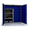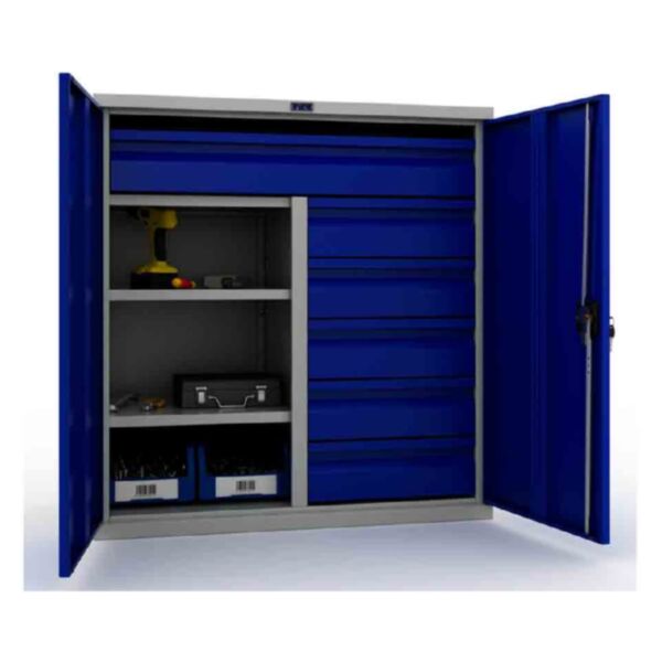 Корпус и двери выполнены из стального листа толщиной 0,8 мм. Конструкция выдерживает нагрузку до 250 кг, что оптимально для небольших рабочих зон. Каждая полка вмещает до 80 кг, а один выдвижной ящик — до 30 кг. Расположение полок можно изменять — шаг регулировки составляет 50 мм, что позволяет рационально использовать объём шкафа.