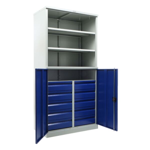 Корпус и дверцы шкафа выполнены из стали толщиной 0,8 мм, благодаря чему изделие устойчиво к физическим нагрузкам и механическому износу. Максимально допустимая нагрузка на весь шкаф — 500 кг, каждая полка выдерживает до 80 кг, а ящик — до 30 кг. Внутреннее пространство настраивается с помощью регулируемых по высоте полок с шагом 50 мм, что позволяет удобно размещать содержимое различного формата.